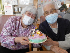 最後におやつの桜餅を食べながら「昔はひな人形は買ってもらえなかったから絵に書いて飾ったんだよ」「孫の為にディズニーのひな人形を買ってあげたんだ」などの思い出話に花を咲かせながら楽しいひと時を過ごしました。