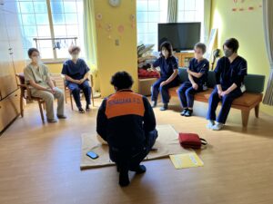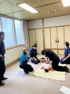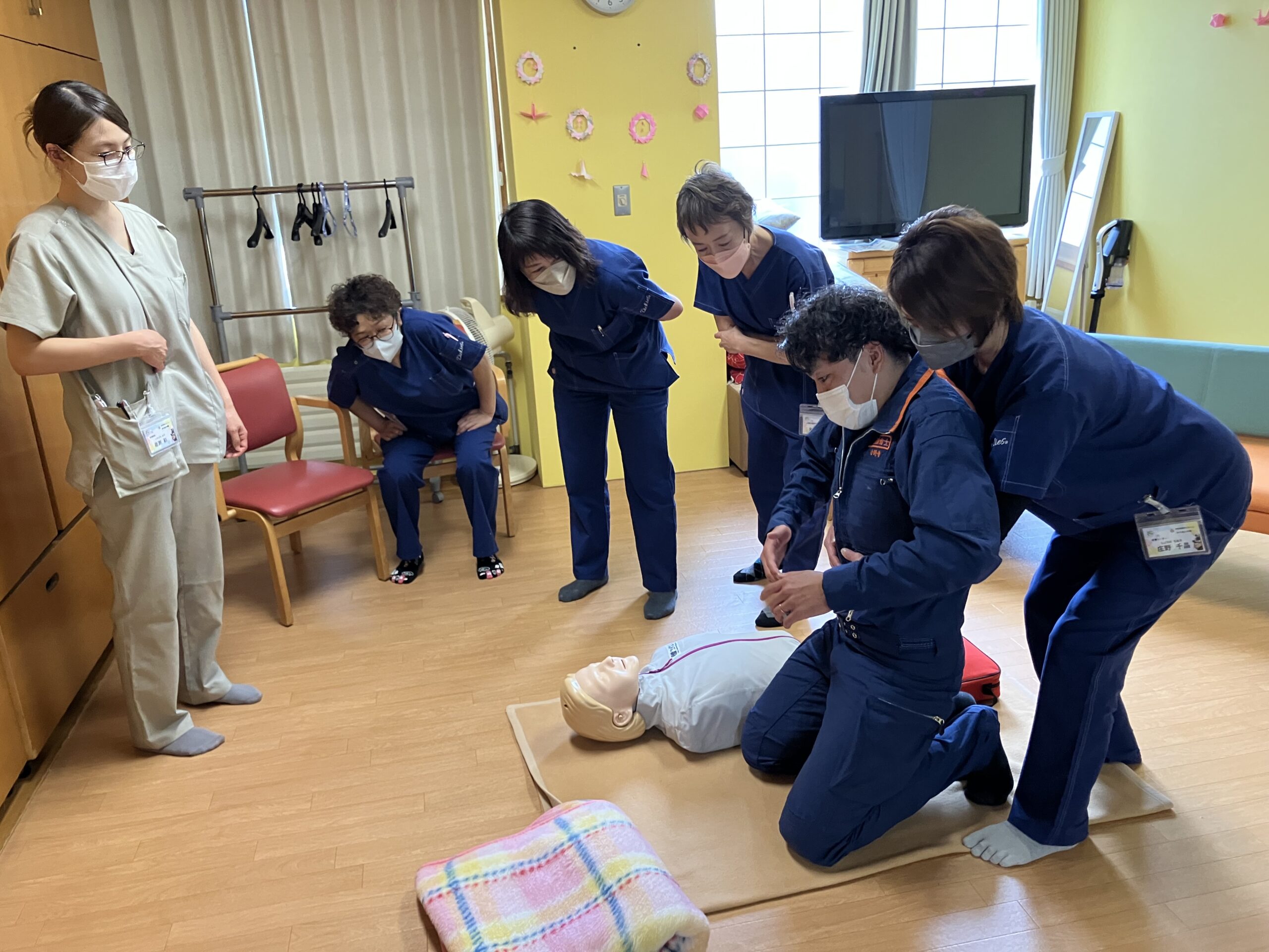 地域密着型介護老人福祉施設ゆうあいの郷特別養護老人ホ-ムゆうあいの郷高齢福祉 利用者様の命を守るため 地域密着型介護老人福祉施設ゆうあいの郷 2026.01.27 特養ゆうあいの郷、地域密着型特養ゆうあいの郷では、近隣の消防署の救命救急隊の皆様をお招きし、「救命救急(心肺蘇生・AED使用方法)を実施しました。 胸骨圧迫の手順やAEDの正しい使い方を、実技を交えて指導していただき、職員は真剣に取り組みながら「いざという時」に備える大切さを再確認しました。 利用者様の安全を守る為、今後も職員の知識と技術の向上に努めてまいります。 ご協力いただいた救命救急隊の皆様、ありがとうございました。
