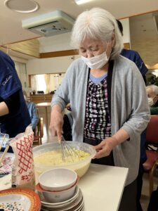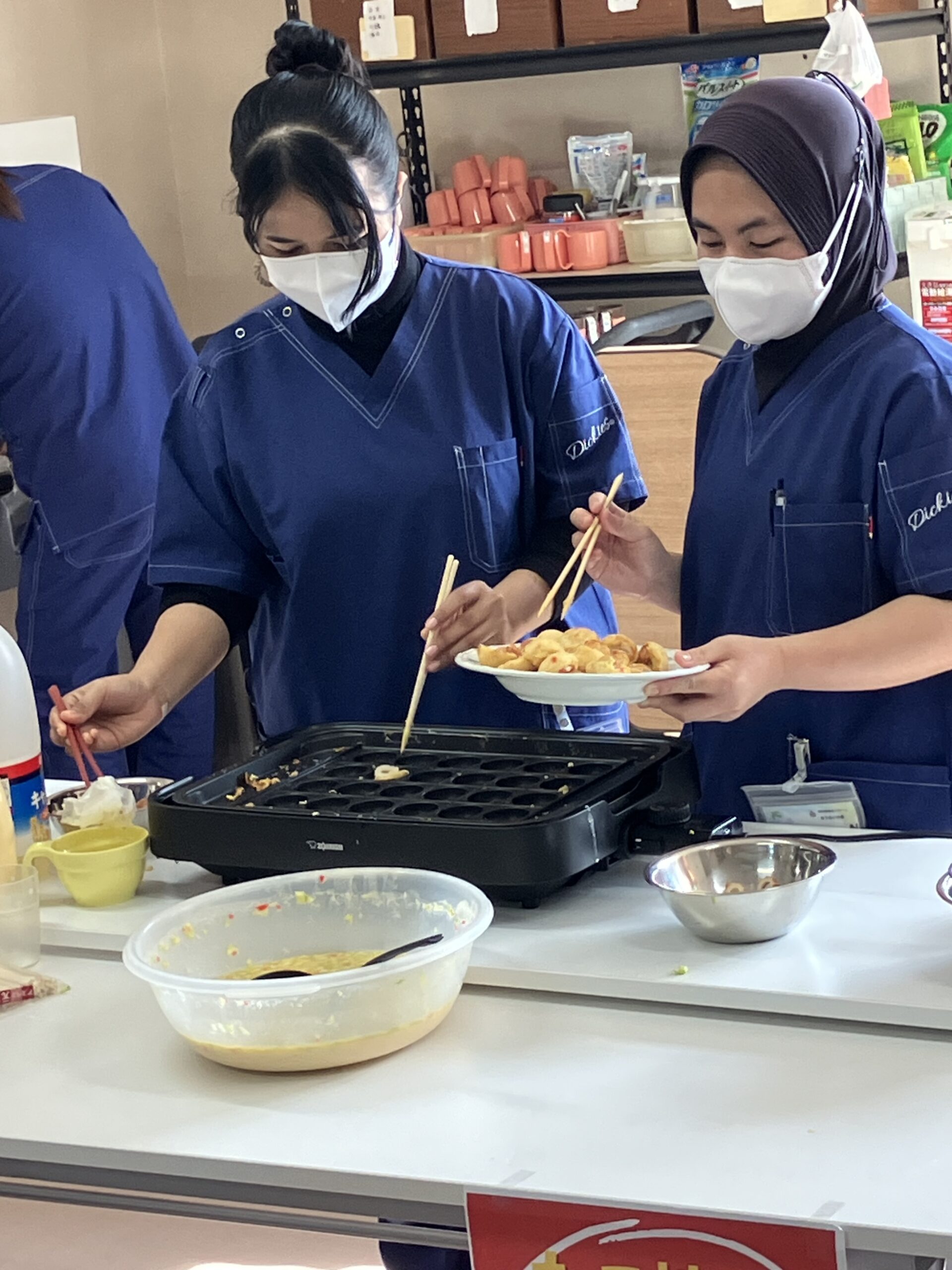 インドネシアから働きに来ている特定技能職員さんが「日本のたこ焼きを食べたことがない」と話していた事がきっかけとなり、利用者さんと一緒にたこ焼きを作ってみよう!という事になりました。